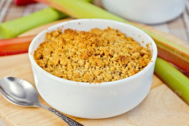 Крамбл с ревенем в чаше на льняной скатерти