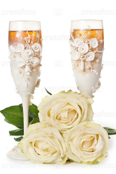 Свадебные бокалы и букет роз на белом фоне