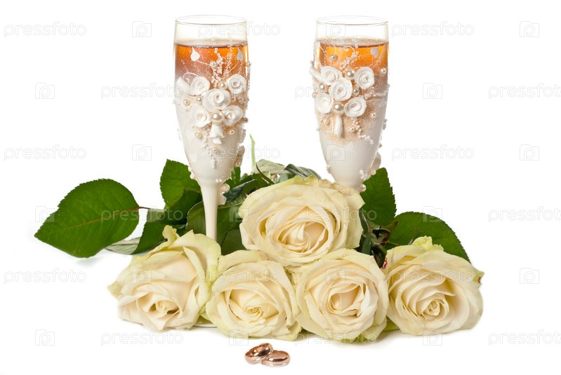 Обручальные кольца, бокалы и букет роз на белом фоне