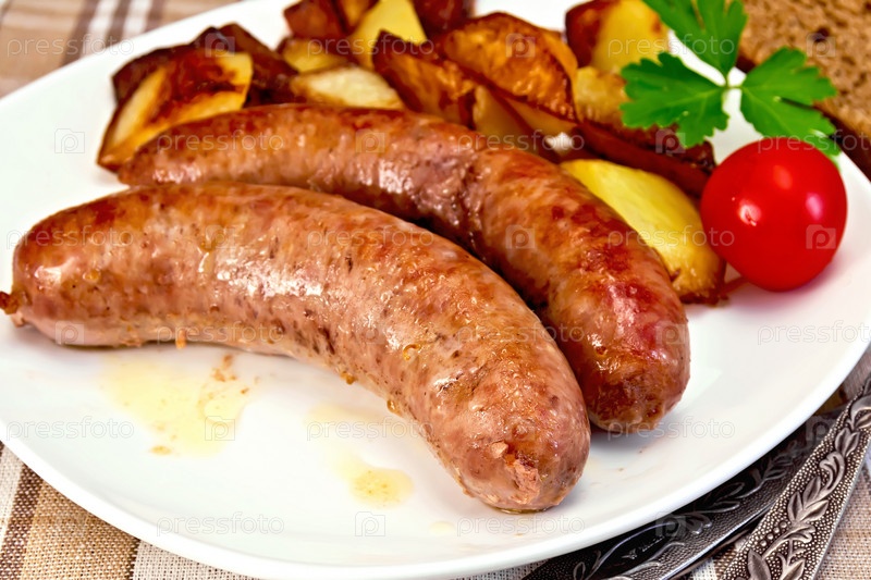 Свиные жареные колбаски с картофелем и помидором