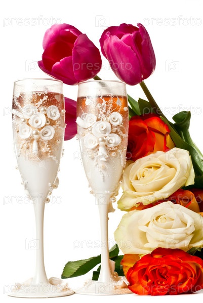Свадебные бокалы и букет цветов на белом фоне
