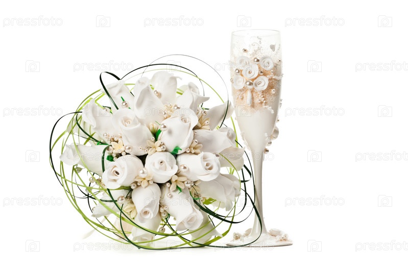 Свадебный бокал шампанского и букет цветов на белом фоне
