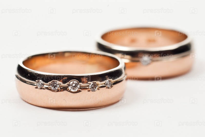 Золотые обручальные кольца с бриллиантами на белом фоне