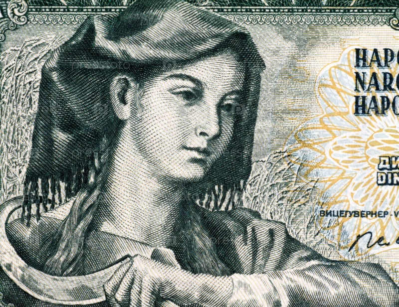 Женщина с серпом на купюре 5 динаров