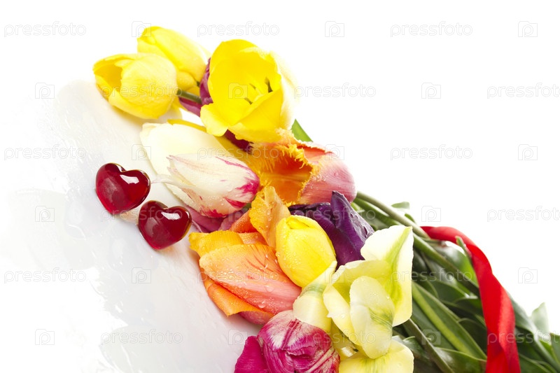 Букет тюльпанов с каплями росы и два красных стеклянных сердечка на белом фоне