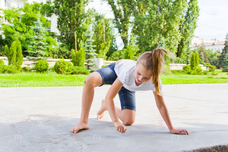 Симпатичная девочка рисует мелом на асфальте