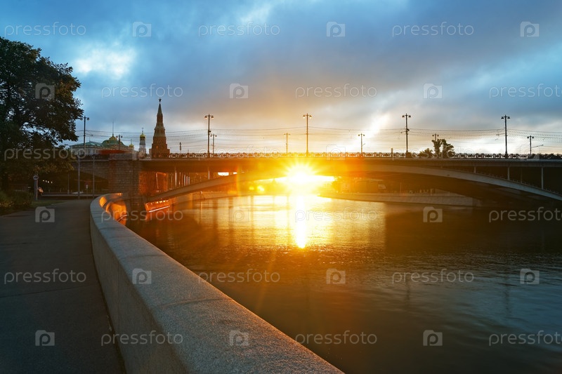 Лучи восходящего солнца под мостом возле Московского Кремля