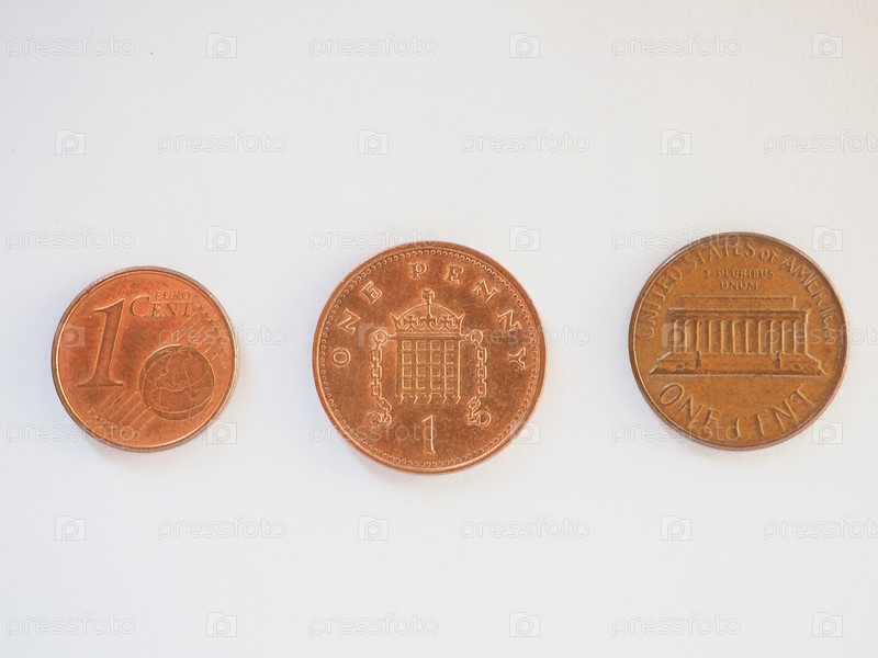 1 евроцент, один британский пенни и один американский пенни
