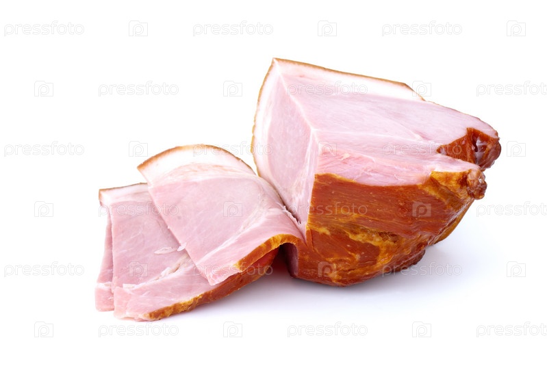 Кусок копченого мяса и несколько ломтиков на белом фоне