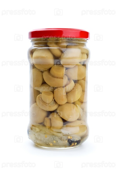 Стеклянная банка с маринованными шампиньонами на белом фоне