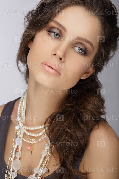 Красивая модель позирует на сером фоне