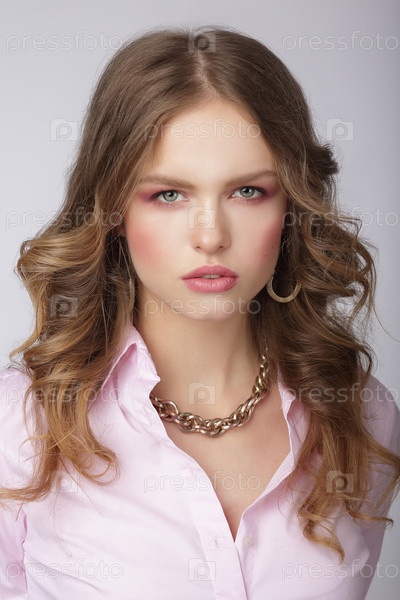 Красивая модель позирует на сером фоне