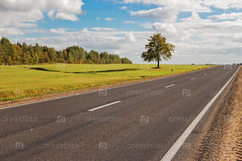 Одинокое дерево в поле и шоссе