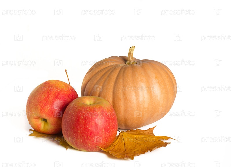 Тыква и яблоки на белом фоне