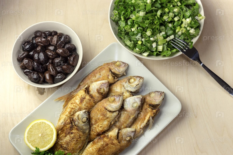 Жаренная рыба барабулька крупным планом (Греческая кухня)