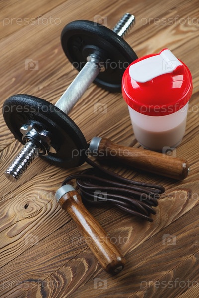 Шейкер с протеином, скакалка и гантель