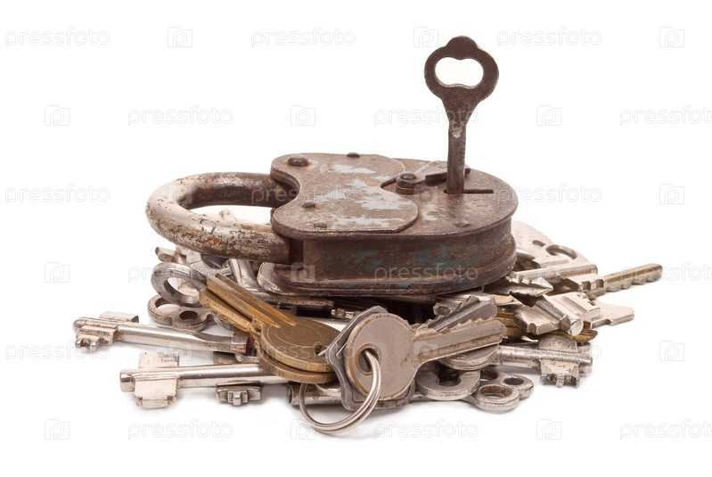 Замок и куча ключей на белом фоне