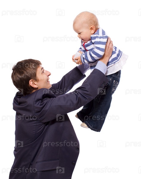 Счастливый отец держит на руках ребенка на белом фоне