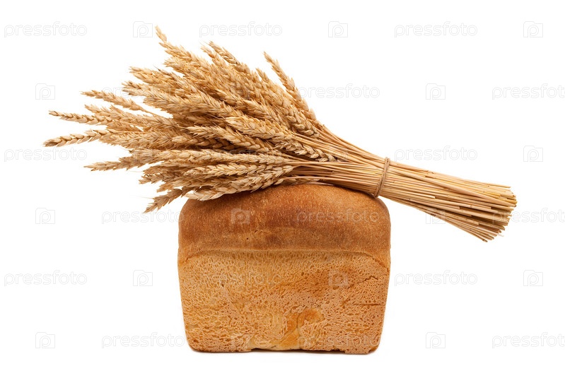 Хлеб и пучок колосьев на белом фоне