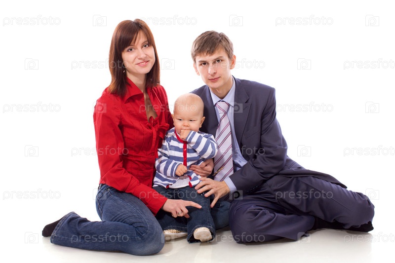 Счастливая семья позирует на белом фоне