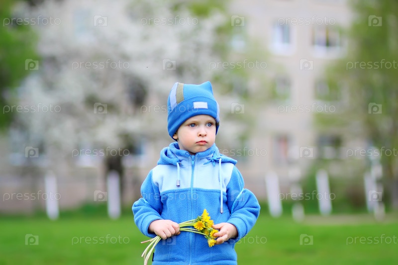 Мальчик с букетом одуванчиков стоит на газоне