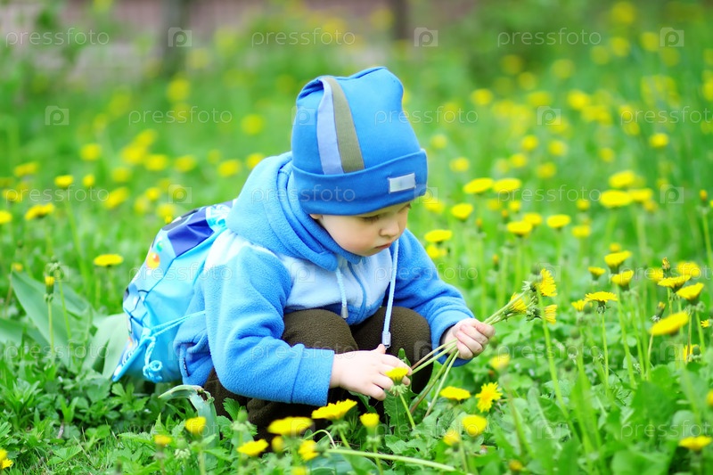 Мальчик собирает одуванчики