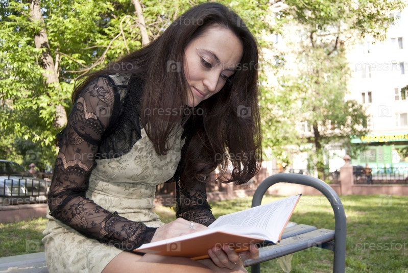 Девушка читает книгу, сидя на скамейке в парке