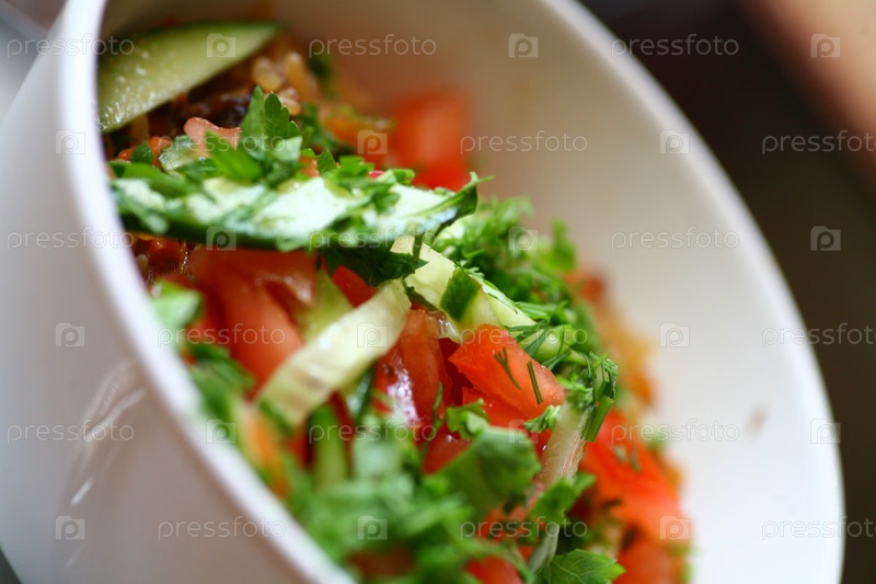 Салат из свежих овощей с перцем и помидорами, крупным планом