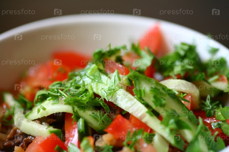 Салат из свежих овощей с перцем и помидорами, крупным планом