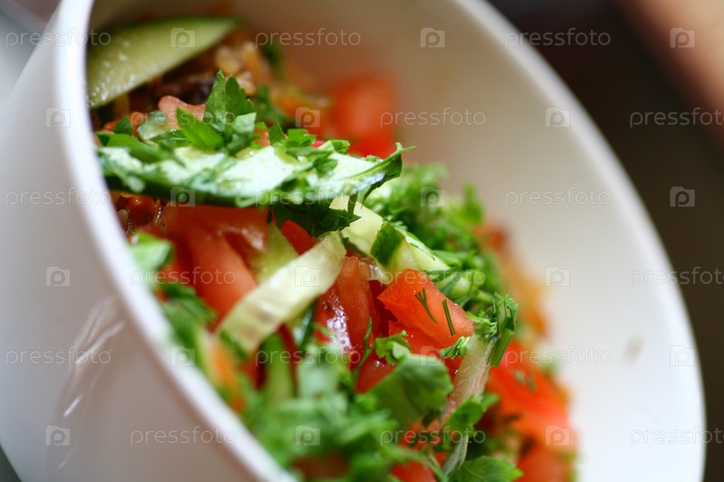Салат из свежих овощей с перцем и помидорами, крупным планом