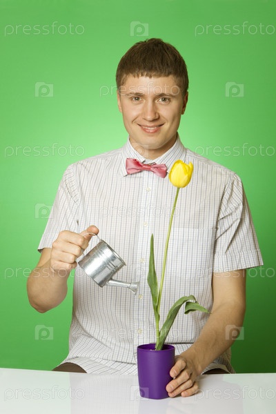 Молодой парень с цветком в горшке и лейкой на зеленом фоне