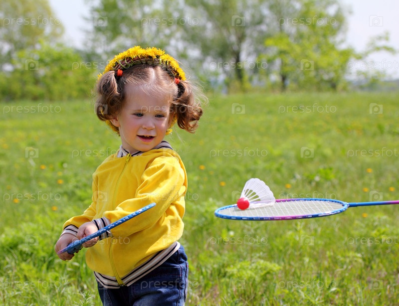 Маленькая девочка с ракетками для игры в бадминтон