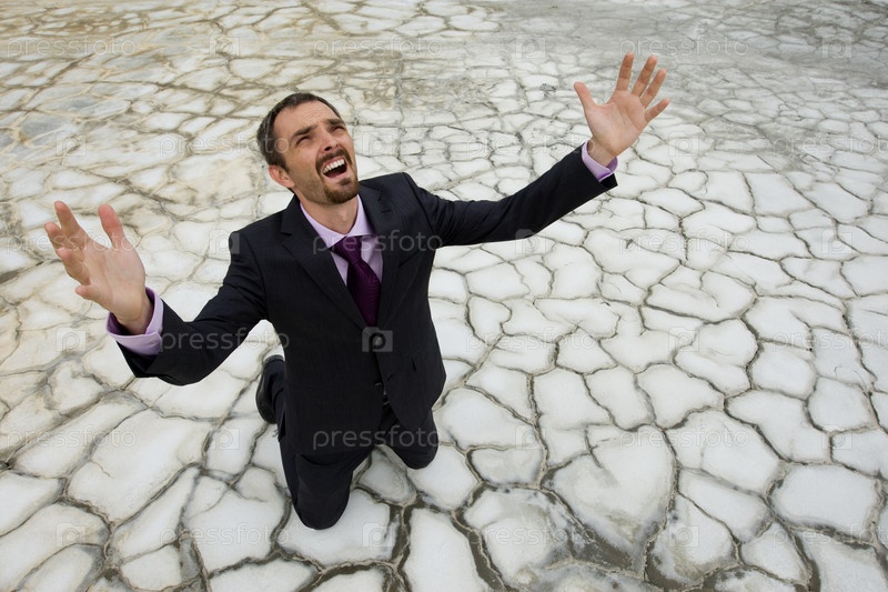 Фото беспомощного бизнесмена, стоящего на сухой земле и поднимающего руки вверх