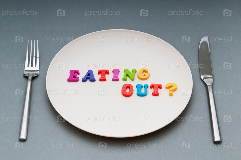 Тарелка с надписью "Питаетесь вне дома?" и столовые приборы на сером фоне
