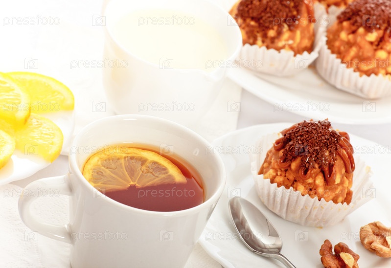 Чай с лимоном и пирожные