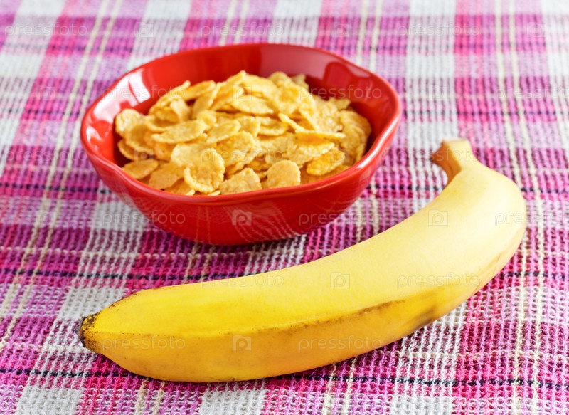 Кукурузные хлопья в миске и банан на салфетке