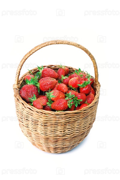 Свежеспелые красные клубники в корзине на белом фоне