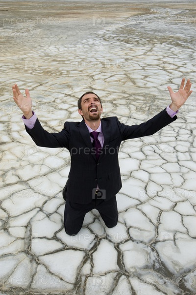 Фото беспомощного бизнесмена, стоящего на сухой земле и кричащего с поднятыми руками