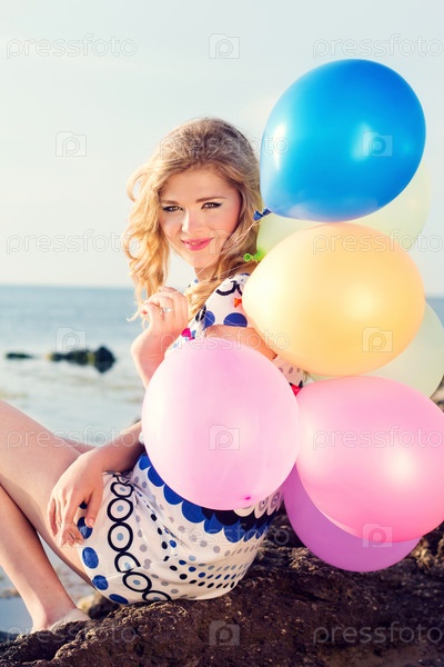 Счастливая девушка с разноцветными воздушными шарами