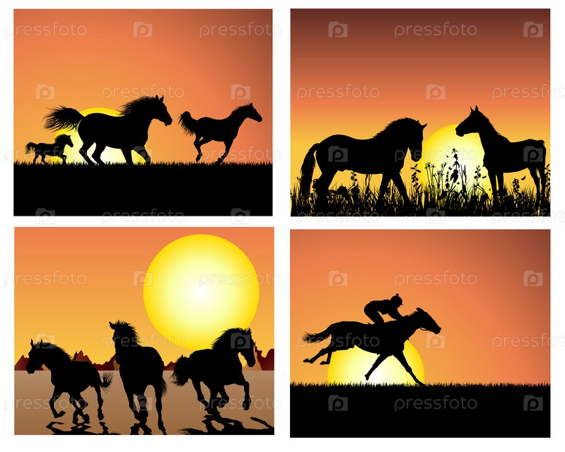 Силуэты лошадей на фоне заката, коллаж