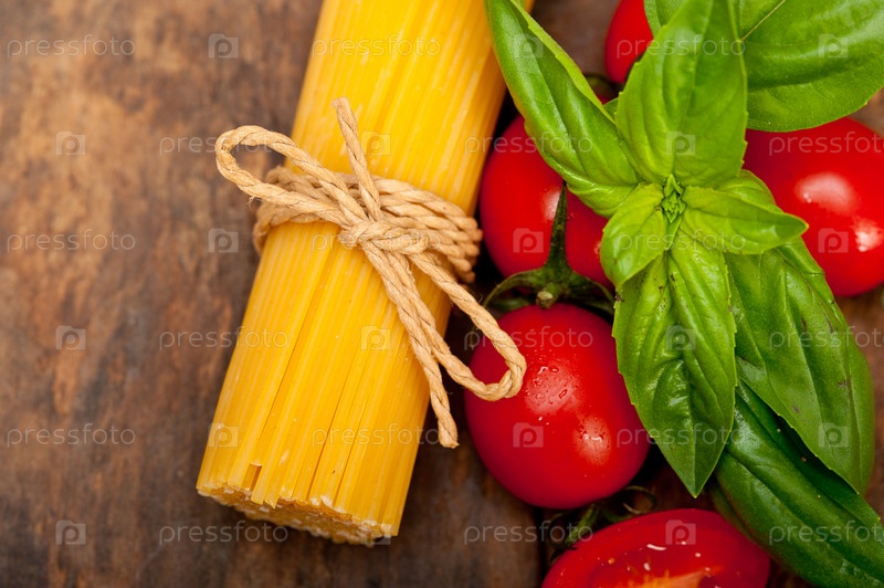 Спагетти, помидоры и базилик