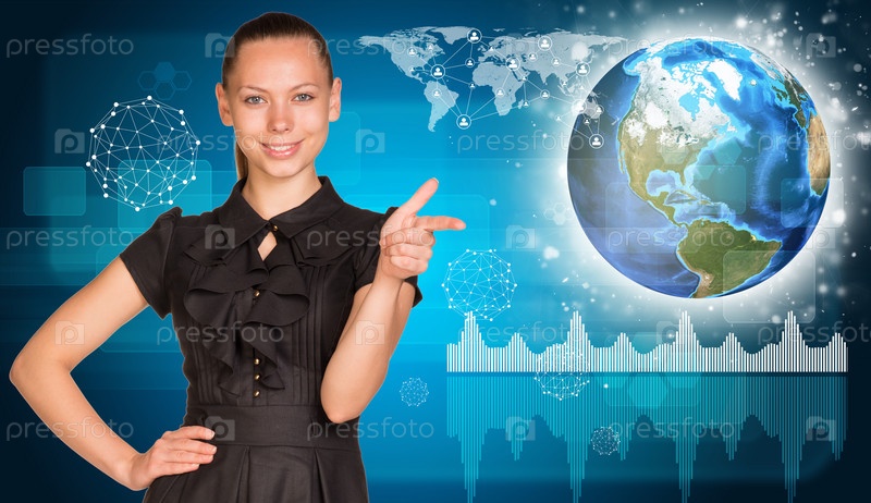 Женщина указывает пальцем на виртуальную панель с иконками