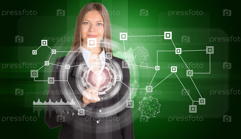 Женщина указывает пальцем на виртуальную панель с иконками