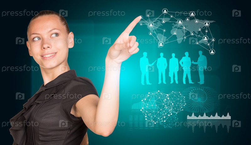 Женщина указывает пальцем на виртуальную панель с иконками