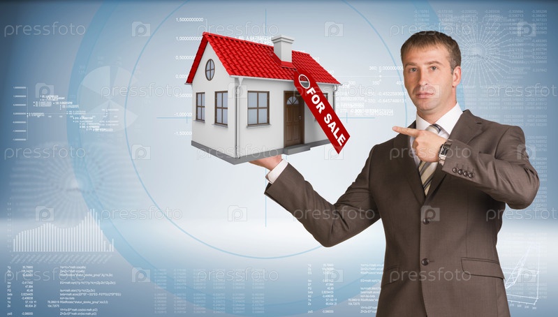 Бизнесмен держит в руке дом с надписью "Продается"