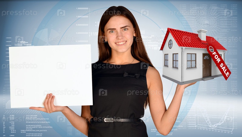 Бизнес-леди с макетом дома с надписью "Продается" и баннером для текста