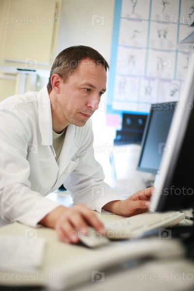 Доктор в белом халате работает на компьютере
