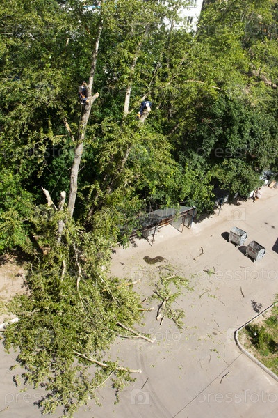 Рабочие убирают сломанные ветви деревьев