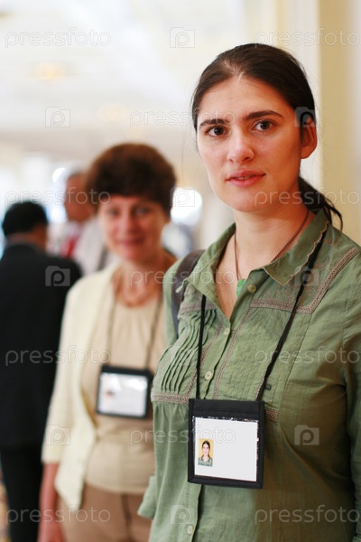 Две женщины с бейджами на выставке