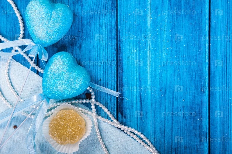 Мармелад и бусы на синем деревянном фоне